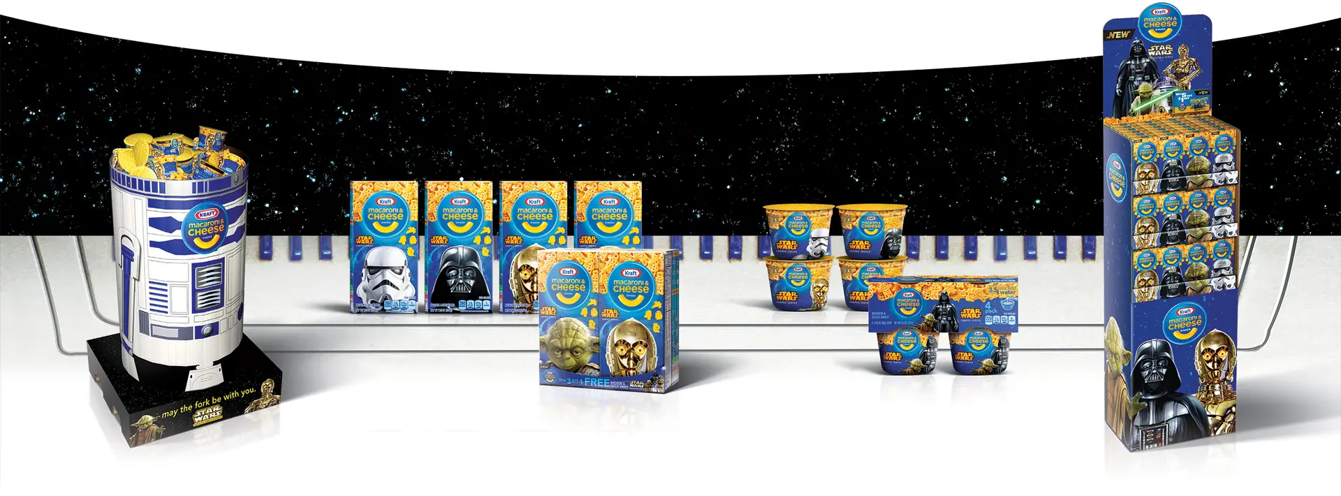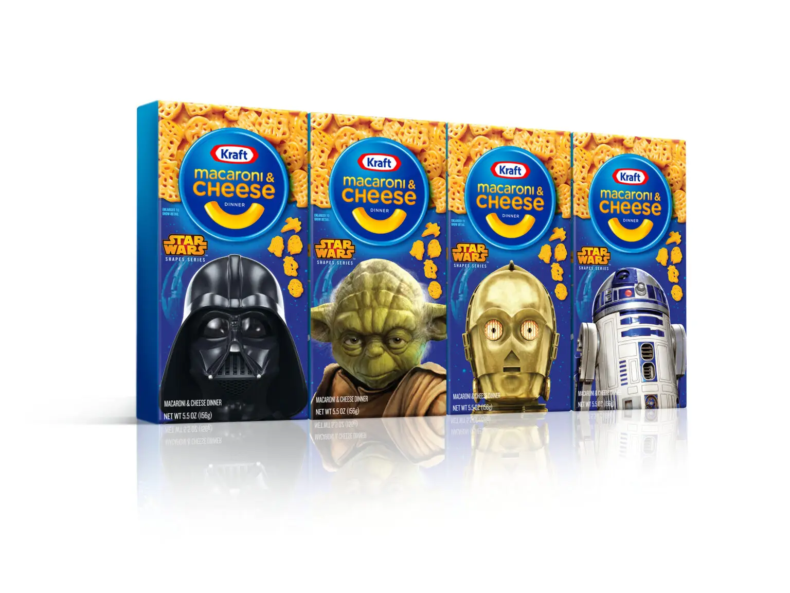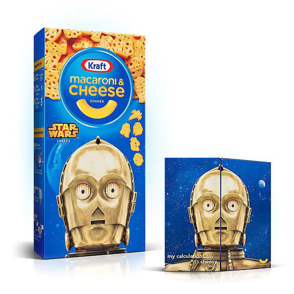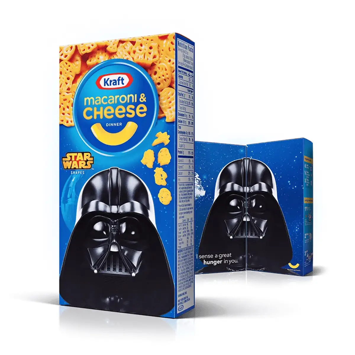 Star Wars Mac & Cheese boxes turned packaging into play—each showing half of a character’s face. Consumers paired two together to complete Yoda, Darth Vader, R2-D2 or C-3PO, a collectible design that sparked aisle excitement and gave fans a reason to grab more than one.