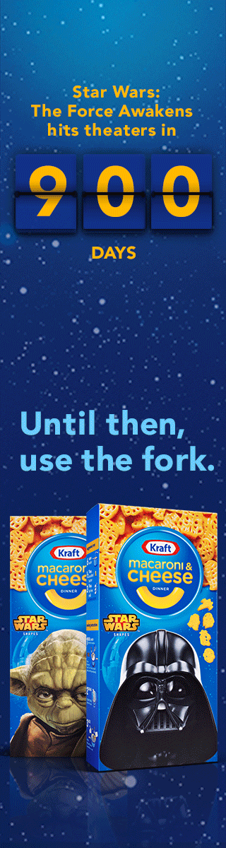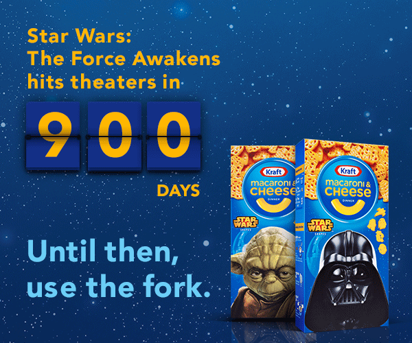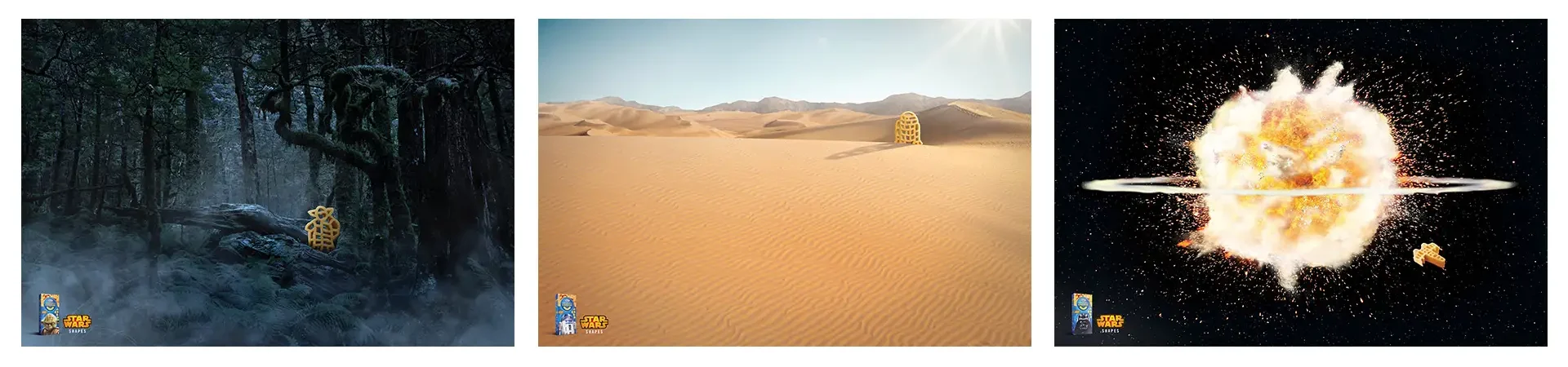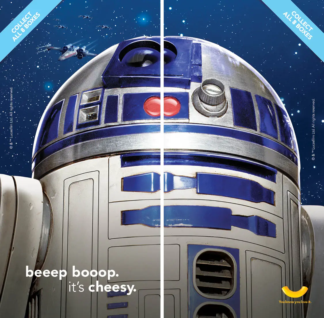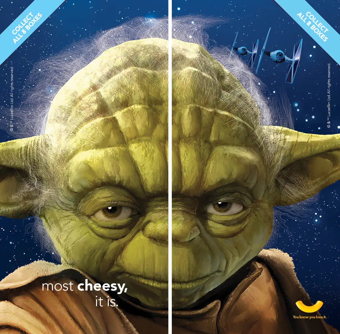 Star Wars Mac & Cheese boxes turned packaging into play—each showing half of a character’s face. Consumers paired two together to complete Yoda, Darth Vader, R2-D2 or C-3PO, a collectible design that sparked aisle excitement and gave fans a reason to grab more than one.