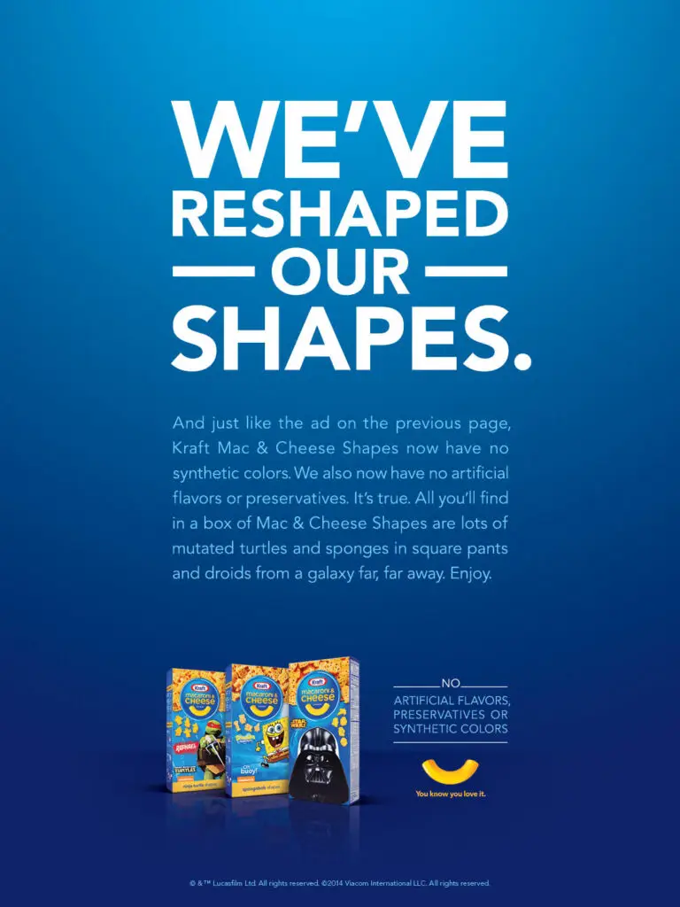 Kraft cleaned up its recipe—removing synthetic colors, artificial flavors, and preservatives—but needed a way to make the change resonate with both parents and kids. The Reshape Our Shapes campaign did just that: for kids, it introduced a new wave of playful pasta shapes inspired by Star Wars, Monsters Inc., Teenage Mutant Ninja Turtles, and more. For parents, it delivered the reassurance of better ingredients. Together, it turned a simple bowl of mac & cheese into something healthier, more fun, and full of everyday adventure.