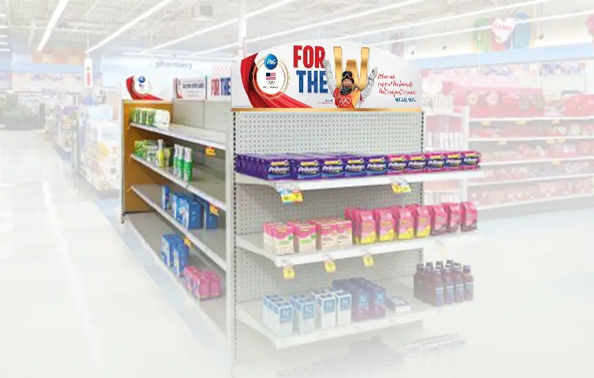 The Olympic story carried through the center store with a branded gondola and focused endcaps—spotlighting key categories and creating multiple touchpoints along the shopper journey.